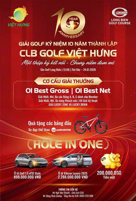 Lễ kỷ niệm 10 năm thành lập sẽ được tổ chức vào ngày 24/1/2026, tại sân golf Long Biên, được kỳ vọng sẽ là sự kiện trọng điểm của CLB Golf Việt Hưng trong năm, quy tụ đông đảo hội viên qua nhiều thế hệ, cùng các khách mời là đại diện các CLB golf bạn bè, doanh nghiệp và đối tác thân thiết.