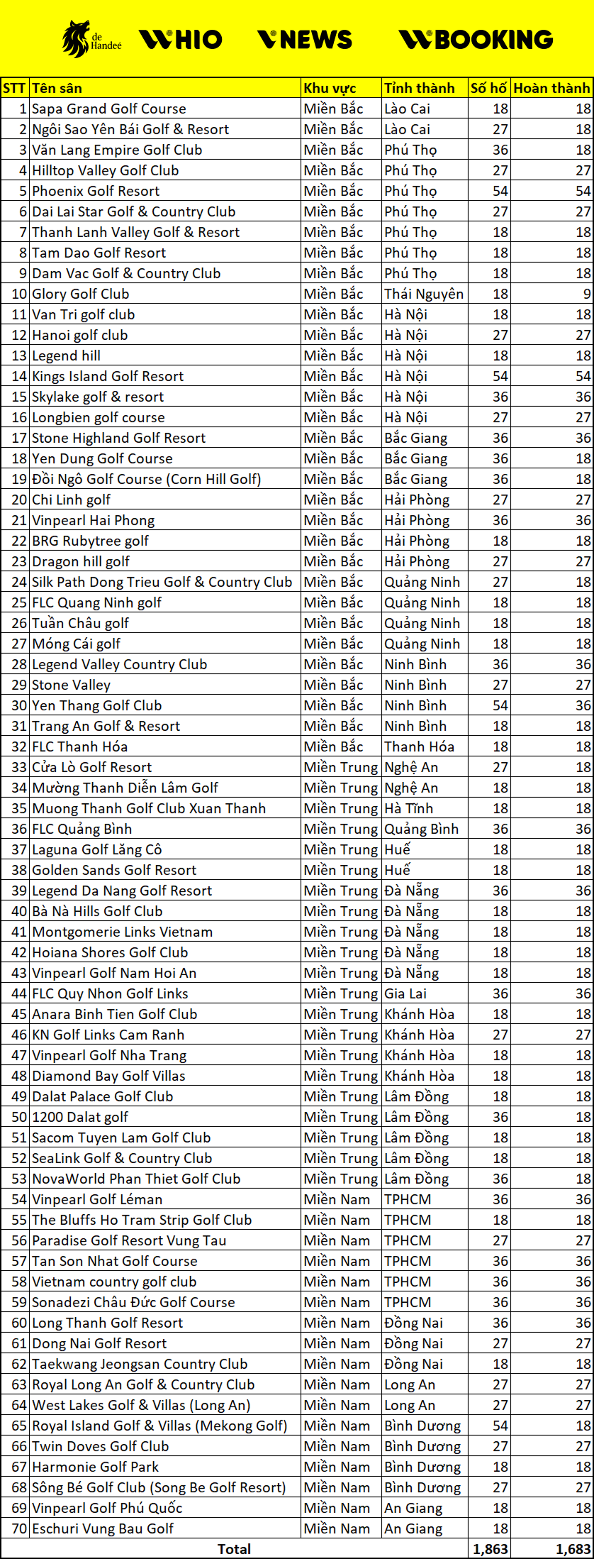 Theo số liệu thống kê chi tiết từ bảng tổng hợp, hệ thống sân golf Việt Nam hiện có 70 sân golf đã được đầu tư, với tổng số hố theo quy hoạch là 1.863 hố. Trong số đó, 1.683 hố đã hoàn thành và đưa vào khai thác thực tế, tương đương khoảng 90,3% công suất thiết kế.