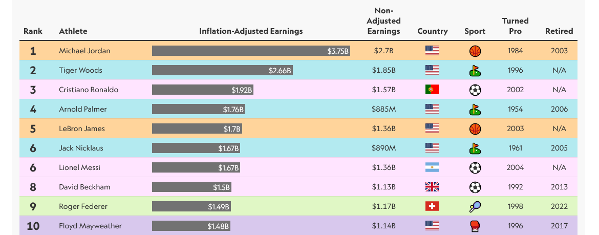 Danh sách 10 vận động viên có thu nhập cao nhất xưa nay theo Sportico